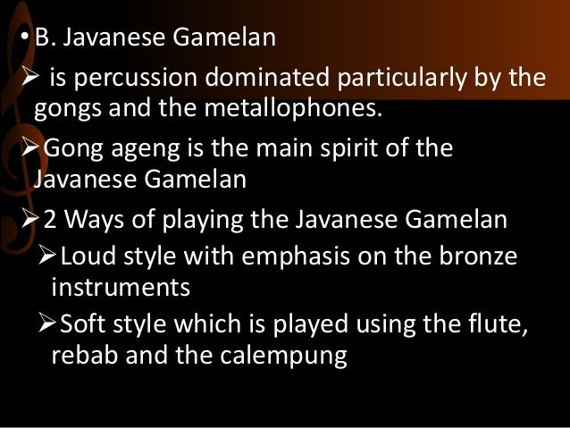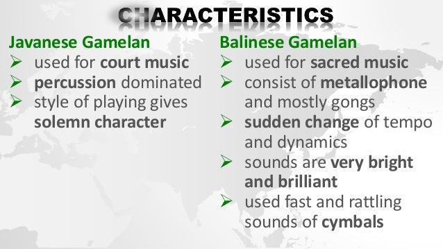 For example Balinese gamelan tends to be more dynamic and nimble alternating quickly between beats. Whereas Javanese gamelan tends to be quieter and solemn. Click to see full answer Just so what are the characteristics of gamelan music.